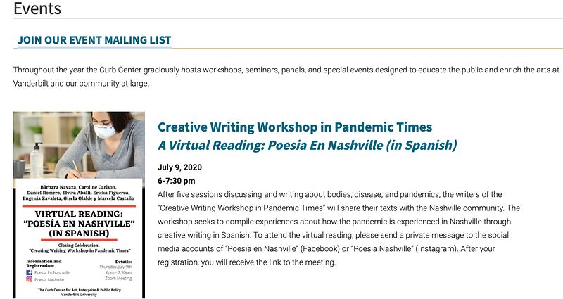 The first volume of "Pandemic Creative Writing. Escritura Creativa Pandémica" was presented on October, 14th. The virtual meeting interwoven testimonies of how the pandemic is affecting the Latinx community in Nashville, and literary short stories. Download the book here